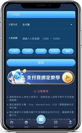富遊娛樂城|支付寶存款教學 ALIPAY DEPOSIT TUTORIAL 支付寶是亞洲地區最常見的第三方支付工具,富遊娛樂城也提供使用支付寶進行充值的便利方式。以下教學將帶你一步步完成支付寶儲值流程,輕鬆完成入金! 如何註冊支付寶? How to register Alipay? 若您尚未擁有支付寶帳戶,可依照以下圖文教學,快速完成註冊與銀行卡綁定設定, 準備好後即可順利進行富遊娛樂城的支付寶儲值操作。 步驟 1: 下載支付寶 請先至 App Store 或 Google Play 商店,搜尋並下載「支付寶」。 步驟 2: 完成手機認證 開啟 App 後,請依下列流程完成註冊: 1.輸入手機號碼 2. 閱讀並同意《服務協議》與《隱私政策》 3.收取簡訊驗證碼並填入完成驗證 完成以上步驟後,即可成功註冊並進入主畫面。 步驟 3:於「支付寶」主畫面 點擊【我的】 從支付寶首頁下方功能列中點選右下角的【我的】,進入帳戶個人中心。 STEP.4:設定支付方式(綁定銀行卡+支付密碼) 請依序完成以下設定,啟用付款功能: 1.點選【銀行卡】進入新增卡片畫面 2.系統會要求您設定 6 位數【支付密碼】,並重複輸入確認 3.接著輸入本人銀行卡號(支援 Visa、MasterCard 等國際卡) 4.綁定成功後畫面會顯示「新增成功」,即完成付款方式設定! #提醒:請使用本人銀行卡,並確認已開啟國際線上交易功能。 支付寶存款操作流程教學 Alipay Deposit Guide 完成支付寶帳戶註冊並綁定銀行卡後,你可以依照以下步驟,快速將資金儲值進入富遊娛樂城帳戶。 Step.1 登入富遊娛樂城 開啟 RG 富遊 APP,輸入您的帳號與密碼,並通過驗證後登入平台。 若尚未註冊,請先完成富遊會員註冊流程。 Step.2 選擇存款選項 登入後,從底部導覽列中點選【存取款】圖示,進入儲值與提款操作頁面。 Step.3 選擇支付寶 在「支付方式」選單中,點選【支付寶】圖示,即可進入儲值金額填寫畫面。 Step.4 輸入儲值金額並送出 在支付寶入款畫面中,輸入您要儲值的金額,支援範圍約為台幣 1,000~6,000,確認金額無誤後點選【送出】 提醒:請依平台限制金額區間填寫,超過或過低可能導致訂單失敗。 Step.5 跳轉支付頁 系統將自動為您建立專屬付款訂單,配對完成後會顯示付款金額與倒數計時,請耐心等待頁面跳轉。 Step.6 啟動支付寶 App 並完成付款 點擊【打開支付寶 App 付款】,系統將自動跳轉至支付寶畫面,確認金額後完成支付流程。 Step.7 返回平台查詢餘額 付款成功後,資金將於 1~3 分鐘內自動到帳。您可回到富遊 APP 按照以下流程查看錢包餘額或於「帳務明細」中確認入金狀態。 我要存款 選擇支付寶儲值的 3 大好處 3 Alipay Top-Up Benefits 跨境入金更方便 即時入帳、不中斷 資金往來安全有保障 常見問題 FAQ FAQ 我要存款 付款失敗該怎麼辦? 請確認您的支付寶帳戶餘額或網路連線是否正常,亦可重新掃描付款。 支付寶是否支援人民幣存款? 可以,請確認付款金額為人民幣並完成掃碼即可。 我無法成功綁定銀行卡,怎麼辦? 請確認您的卡片是否支援國際線上交易,並已啟用海外支付功能。建議使用 Visa 或 MasterCard 並開通 3D 驗證機制。 我付款成功但富遊帳戶沒有入帳? 可能是瀏覽器阻擋了跳轉。建議使用 Chrome、Safari 並允許頁面開啟外部應用程式。也可手動複製付款連結至支付寶 App 中操作。 付款時跳不出支付寶 App? 若因系統障礙,造成富遊娛樂城會員無法於30分鐘內提款完成,富遊娛樂城將立即派送補償金已表達誠摯的歉意。 我不小心選錯金額或付款兩次,錢還能退嗎? 每筆訂單僅限支付一次,重複付款款項無法自動退回。請第一時間聯繫客服協助申請補單或備案。 「支付寶存款」注意事項 請使用本人支付寶帳號進行儲值,避免帳號風控或審核延遲 每筆訂單限時付款,逾時未完成將自動失效 若付款後 10 分鐘內尚未入帳,請準備付款憑證並聯繫客服協助處理 我要存款